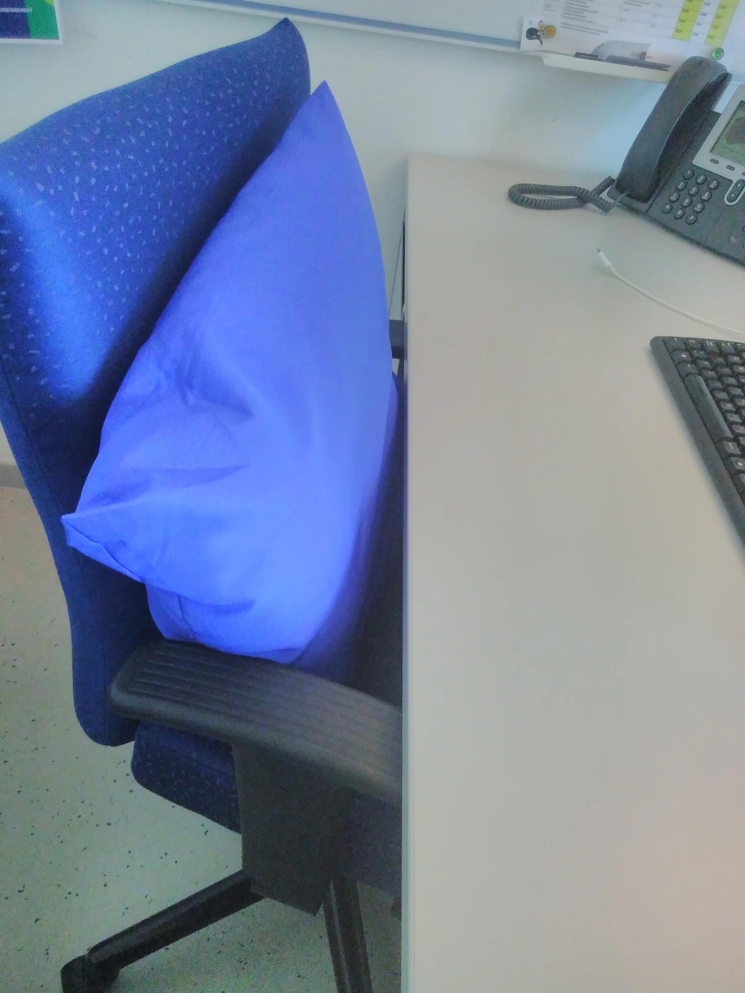 Et de retour au travail, le bleu du coussin de la chaise de ma collègue. Ou le bleu de travail de bureau.